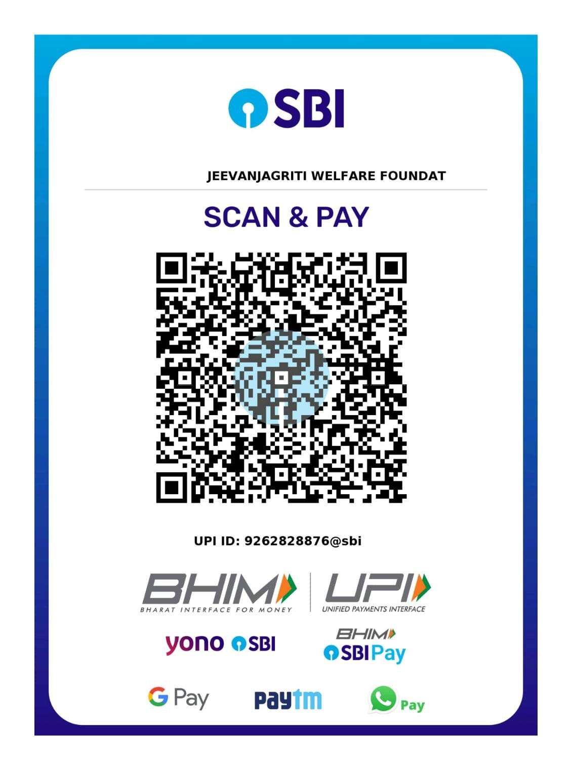ACCOUNT HOLDER NAME: JEEVANJAGRITI WELFARE FOUNDATION